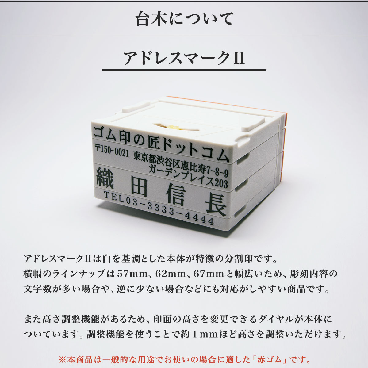 | 商品名称 | ゴム印/住所印/アドレスマークII(赤ゴム)/分割印/親子判/62mm×8.5mm(1~2行) |
