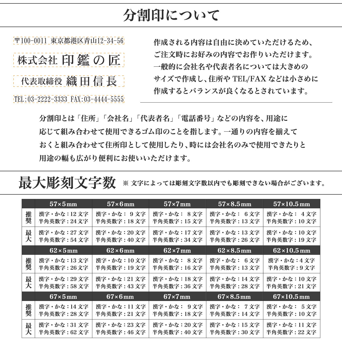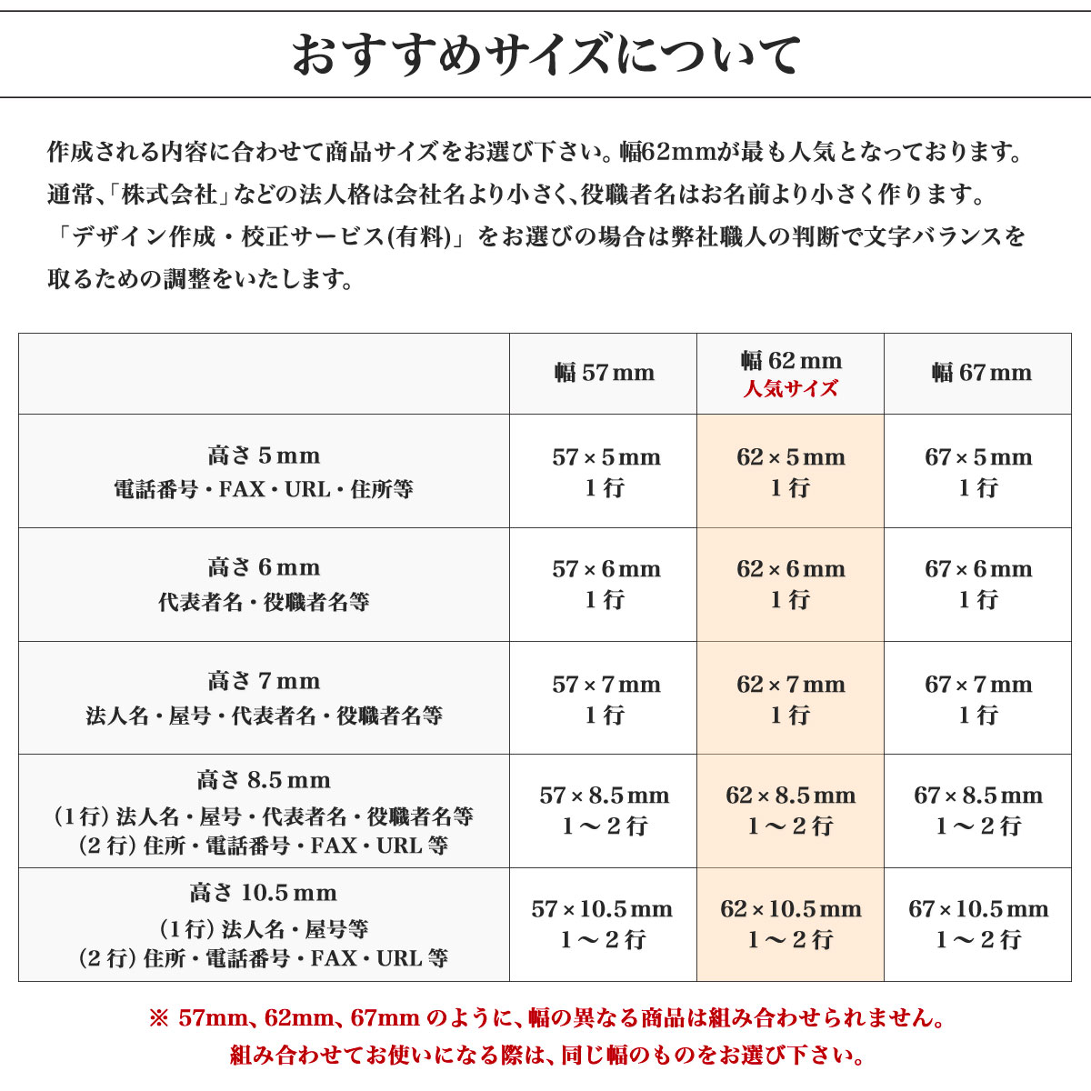 作成内容に合わせて商品をお選びください。幅62mmタイプが最も売れ筋の商品となっております。 通常は法人格は会社名より小さく、役職者名はお名前より小さく作ります。 有料の「デザイン作成・校正サービス」をお選びの場合はこれらを踏まえ、弊社側の職人の判断にて調整いたします。 文字の大きさに合わせて高さをご選択ください。 高さ8.5mmと10.5mmは1行(大きい文字)と2行(小さい文字)から選ぶことができます。 |