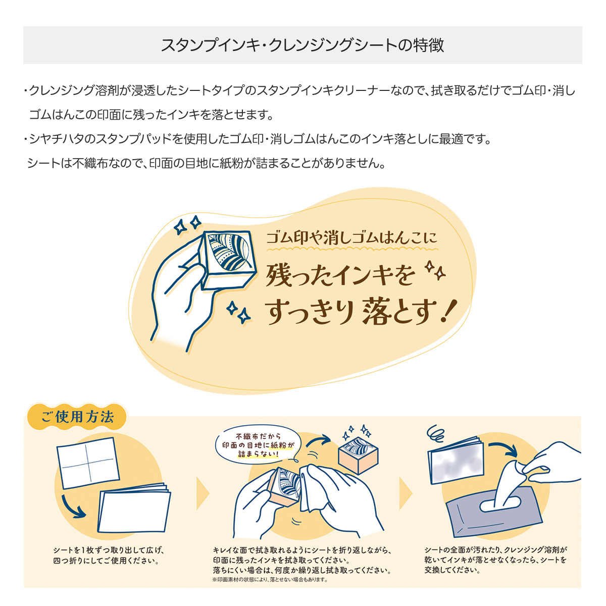 「スタンプインキ・クレンジングシート」は、シャチハタのスタンプパッド(対象商品はページ下部にてご紹介しています)を使用したゴム印や消しゴムはんこのインキ落としに最適なクレンジングシートです。