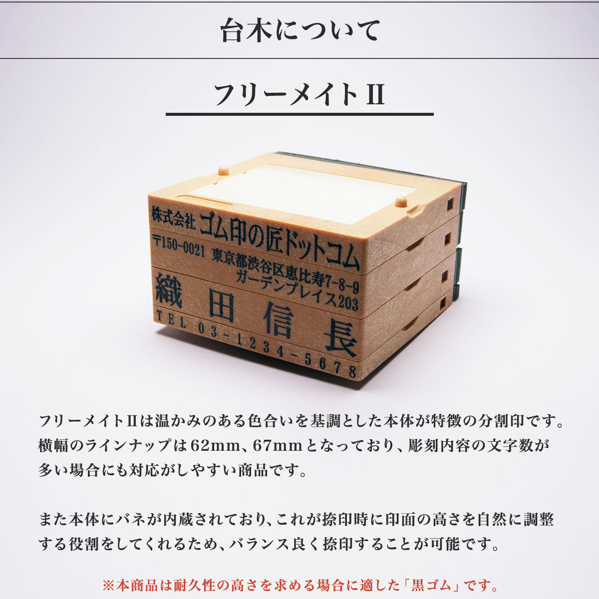 | 商品名称 | ゴム印/住所印/フリーメイトII(黒ゴム)/分割印/親子判/62mm×7mm(1行) |