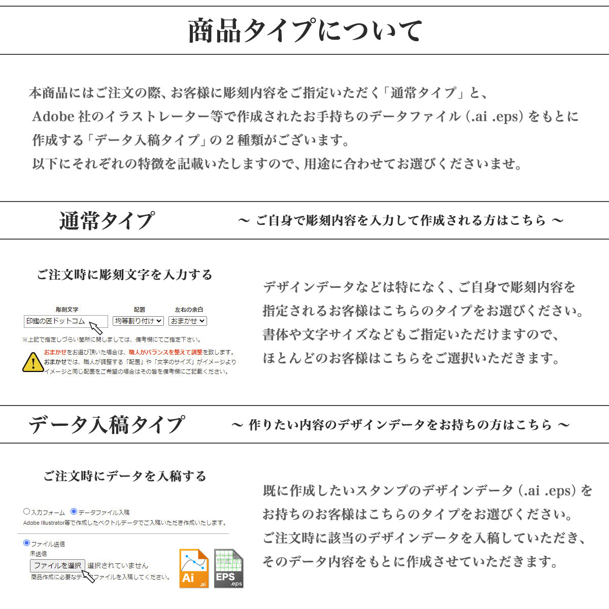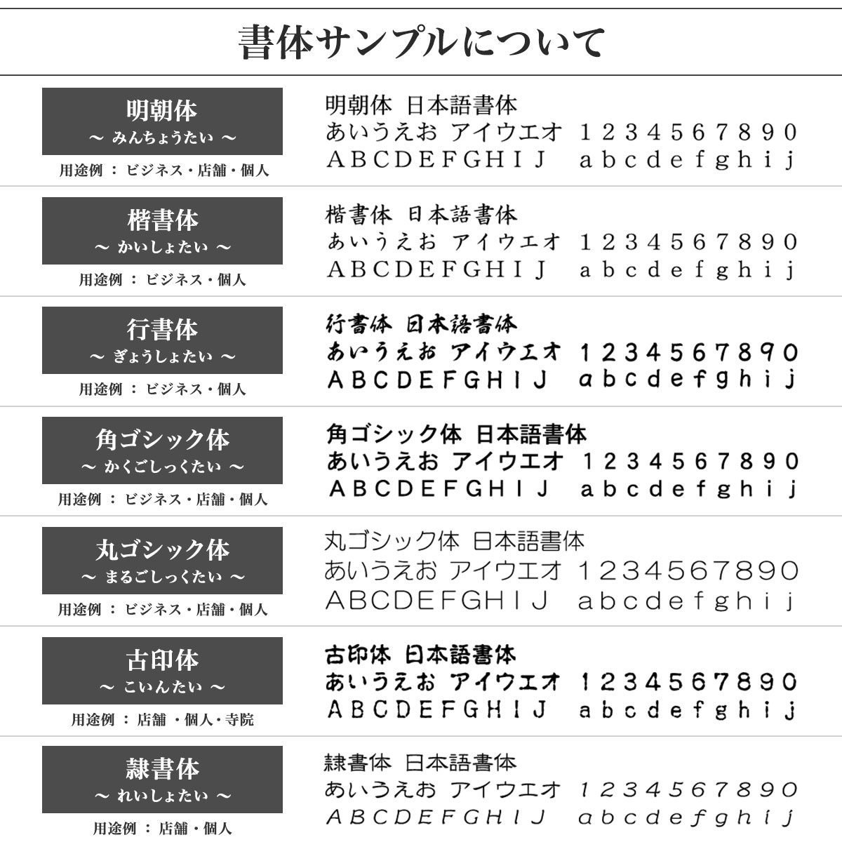 作成内容に合わせて商品をお選びください。幅62mmタイプが最も売れ筋の商品となっております。 通常は法人格は会社名より小さく、役職者名はお名前より小さく作成します。 有料の「デザイン作成・校正サービス」をご利用の場合は、弊社側の職人の判断にてそのように調整いたします。 文字の大きさに合わせて高さをご選択ください。 高さ8.5mmと10.5mmは1行(大きい文字)と2行(小さい文字)から選ぶことができます。 |