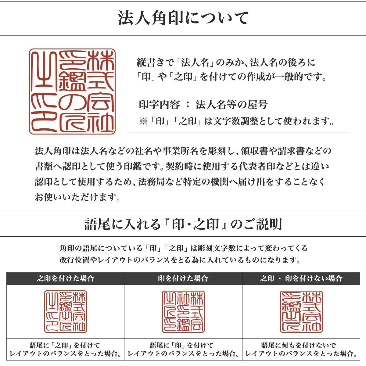 角印の語尾についている「印」「之印」は彫刻文字数によって変わってくる改行位置やレイアウトのバランスをとる為に入れているものになります。 基本的に入れる必要はありませんが、古くから印鑑であると言うことを示す文字として使われてきました。